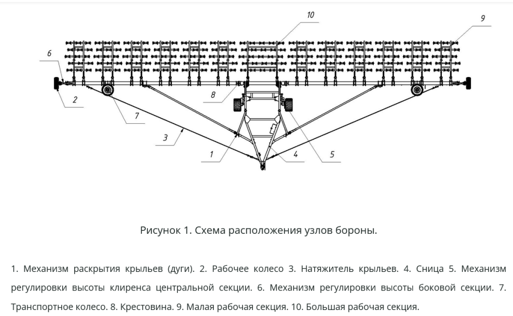 Рабочий орган – пружина конусного кручения с двумя концами диаметром ,10 мм. В конструкцию бороны входят: рама, дышло, крылья, каретки. Также в конструкцию входят монтажная, стержневая и рабочие части (это и есть пружинный зуб). Агрегация бороны пружинной с тракторами должна осуществляться по соответствующим классам.