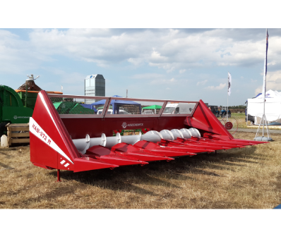 Продвигаясь по рядам, транспортер стеблей безударно подает стебли подсолнечника к сегментно-дисковому ножу режущего аппарата. Вибротранспортеры обеспечивают равномерную и без потерь подачу корзинок и семян к шнеку, который все подает в наклонную камеру комбайна. Конструкция делителей рядков и боковых делителей позволяет поднимать сильно опустившиеся стебли и боковые стебли с корзинками и подать их к транспортеру стеблей. Этим достигается уменьшение потерь семян.