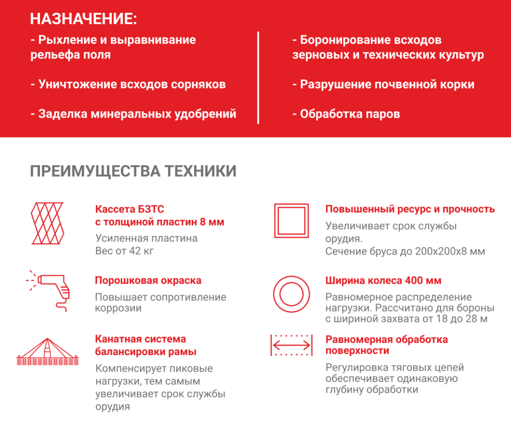 Бороны гидрофицированные тяжелого веса (БЗТС-1,0) применяют на рыхлых и легких почвах. Они рыхлят их на глубину до 6 см.