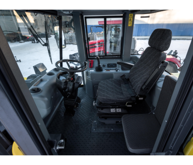 Кабина двухместная, тепло-шумо-изолированная, с регулируемым тепловым режимом, с центральным расположением сиденья водителя, встроенным каркасом безопасности, защищающим оператора от опрокидывании машины (ROPS) и от падающих предметов (FOPS). Удобное расположение органов управления, подрессоренное сиденье водителя, тонированные стекла. Кондиционер устанавливается штатно.