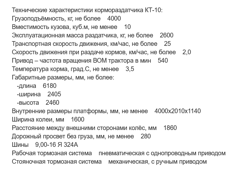 приём и транспортировка измельчённых листостебельных кормов, злаковых или бобовых трав, измельчённой соломы, резанных корнеплодов, а также полнорационных кормовых смесей и раздача их во время движения непрерывным регулируемым потоком в кормушки с высотой борта не более 750 мм и шириной кормового прохода животноводческих комплексов не менее 2100 мм или подачи в загрузочные воронки стационарных раздатчиков на животноводческих фермах, на откормочных площадках, выгульно-кормовых дворах и летних лагерях.