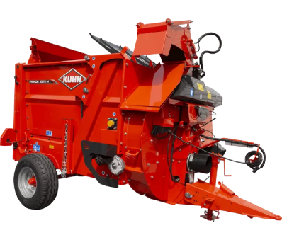 В случае с тяжелыми кормами (корма с длинными волокнами и тюки сенажа), низкое расположение стрелы не позволяет фуражу попасть в турбину. Таким образом, волокна эффективно и равномерно распределяются.