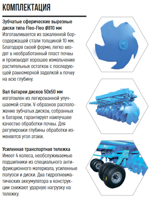 Вместе с оптимально устроенной конструкцией рабочих органов дисковая борона БДТ «Вепрь» имеет и абсолютно надежную сборку, которая включает в себя прочную центральную раму из труб сечением 200х100х10 мм, защищенные от механических повреждений подшипниковые узлы, гидропневмоаккумулятор и усиленные гидроцилиндры, которые изготовлены по итальянской технологии.