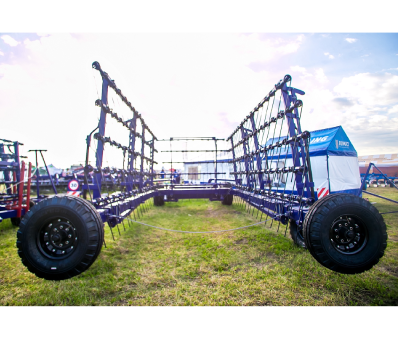 Борона с пружинным зубом полуприцепная гидрофицированная тяжелая ПОБЕДА БЗГТ-15. Ширина захвата бороны — 15,9 м. Производительность 15-23 гектара в час.