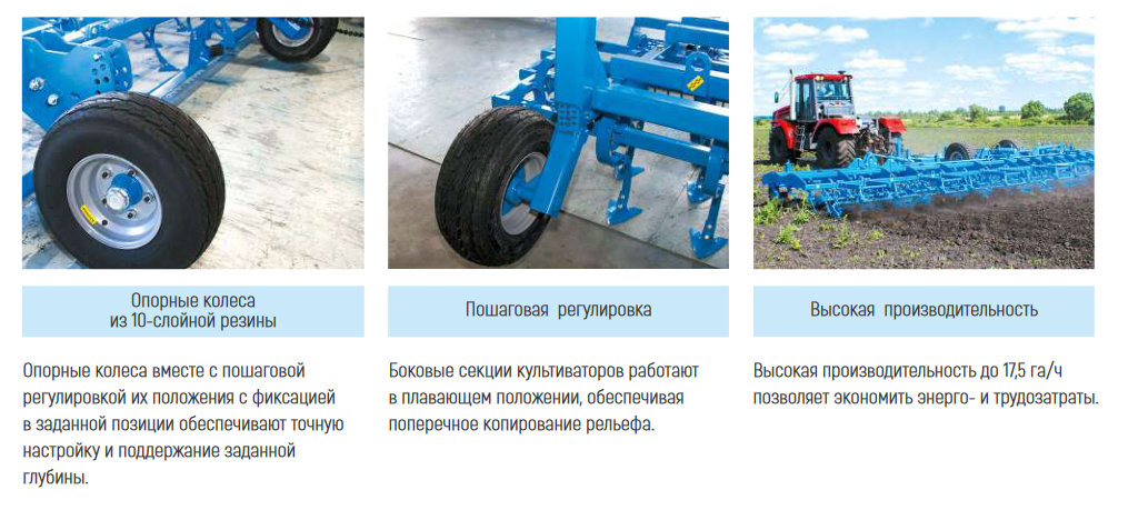 • Одинарные или парные опорные колеса. Регулировка и стабильное поддержание глубины почвообработки обеспечивается продуманной работой опорных колес.