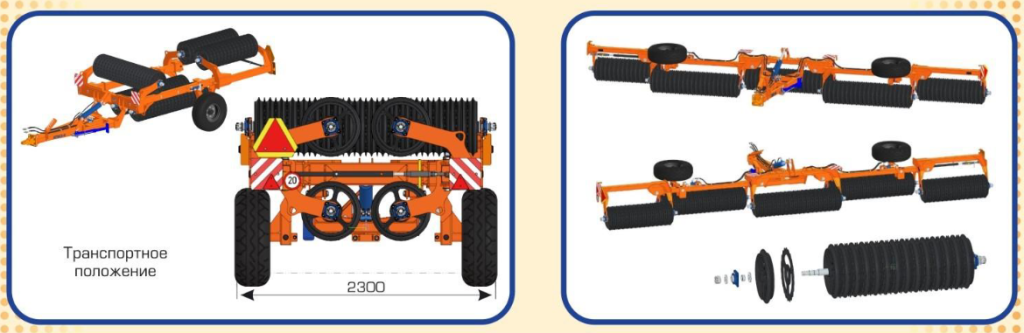 Конструкция катка состоит из пяти модулей: центральный (2 м), 2 боковых (2 м), 2 крайних (1,5 м). Модули связаны между собой шарнирными соединениями, что позволяет копировать неровности поля в пределах ширины модулей. Модуль представляет собой несущий брус, к щекам которого крепится каток (каток имеет возможность демонтажа от модуля без снятия модуля с основной конструкции).
