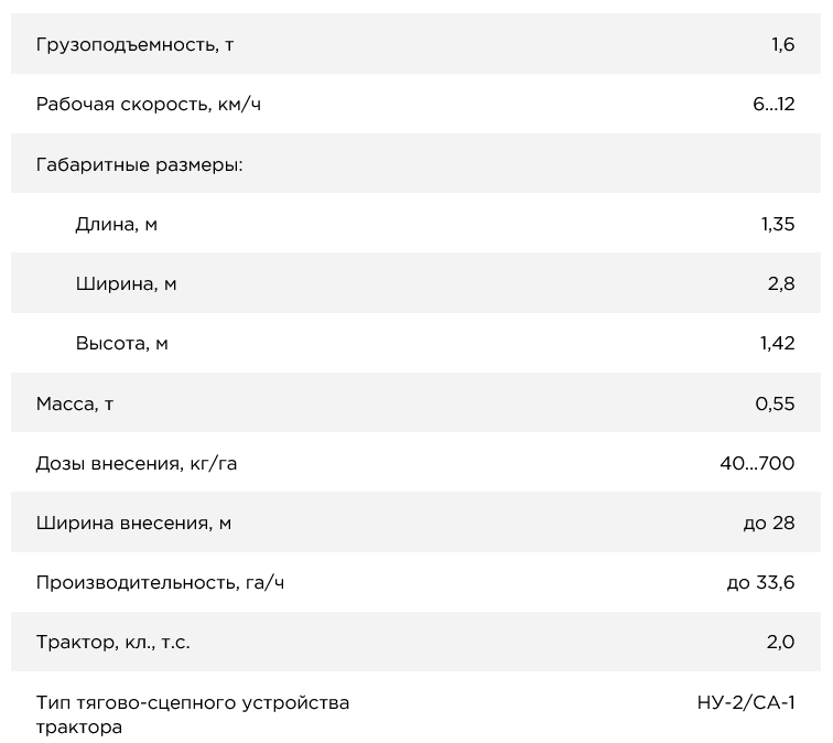 Распределитель удобрений РУ-1600 предназначен для поверхностного внесения твердых минеральных удобрений в гранулированном и кристаллическом виде, а также для подкормки озимых зерновых культур (в ранней стадии развития), лугов и пастбищ.Технические характеристики