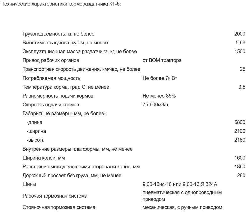 Назначение: приём и транспортировка измельчённых листостебельных кормов, злаковых или бобовых трав, измельчённой соломы, резанных корнеплодов, а также полнорационных кормовых смесей и раздача их во время движения непрерывным регулируемым потоком в кормушки с высотой борта не более 750 мм и шириной кормового прохода животноводческих комплексов не менее 2100 мм или подачи в загрузочные воронки стационарных раздатчиков на животноводческих фермах, на откормочных площадках, выгульно-кормовых дворах и летних лагерях.