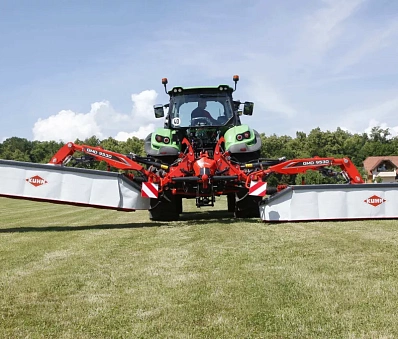 Возможность подъема двух задних частей по отдельности является существенным преимуществом при кошении участков треугольной формы. Маневрирование теперь не представляет сложности и выполняется быстрее. Блок косилки приводится в транспортное положение с помощью клапана двойного действия.