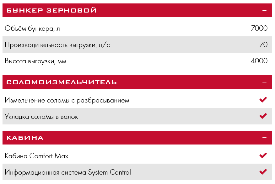 - Высокоинерционный молотильный барабан максимально большого диаметра и подбарабанье с углом обхвата 130° обеспечивают условия для качественного обмолота, в том числе на высокостебельных, скрученных и засоренных хлебах.