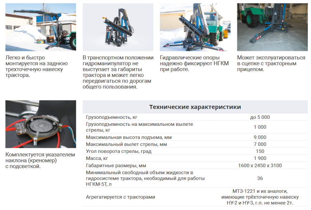 Навесной гидравлический кран-манипулятор НГКМ-5Т предназначен для разгрузочных и погрузочных работ в сельскохозяйственной, коммунальной и ремонтно-строительной сферах.