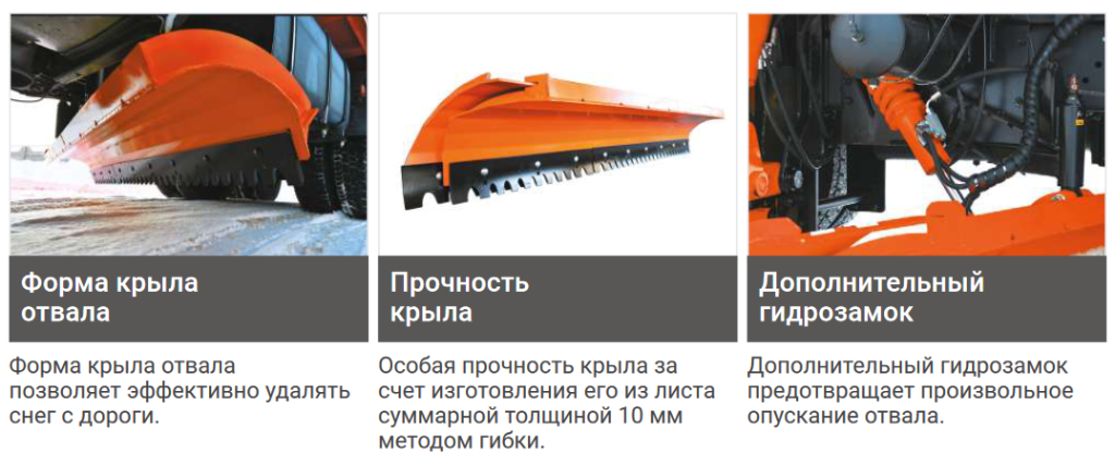 СГОН-3 изготавливается методом гибки из двойного листа легированной стали, что предает ему особую прочность, а форма крыла обеспечивает высокую эффективность при его работе. Конструкцией предусмотрена пружина гидроподжима отвала к дорожному полотну, которая регулирует давление режущей кромки, и в тоже время выполняет защитную функцию при наезде на препятствие.