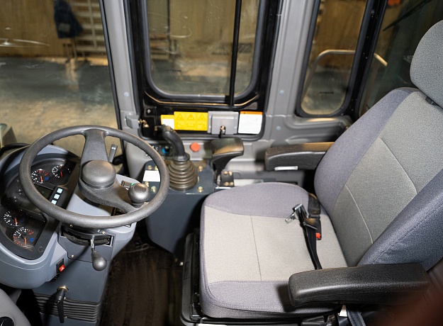 • Регулируемой рулевой колонкой и сиденьем оператора с механической подвеской, высокой спинкой, регулируемыми подлокотниками, подголовником, для снижения усталости оператора.