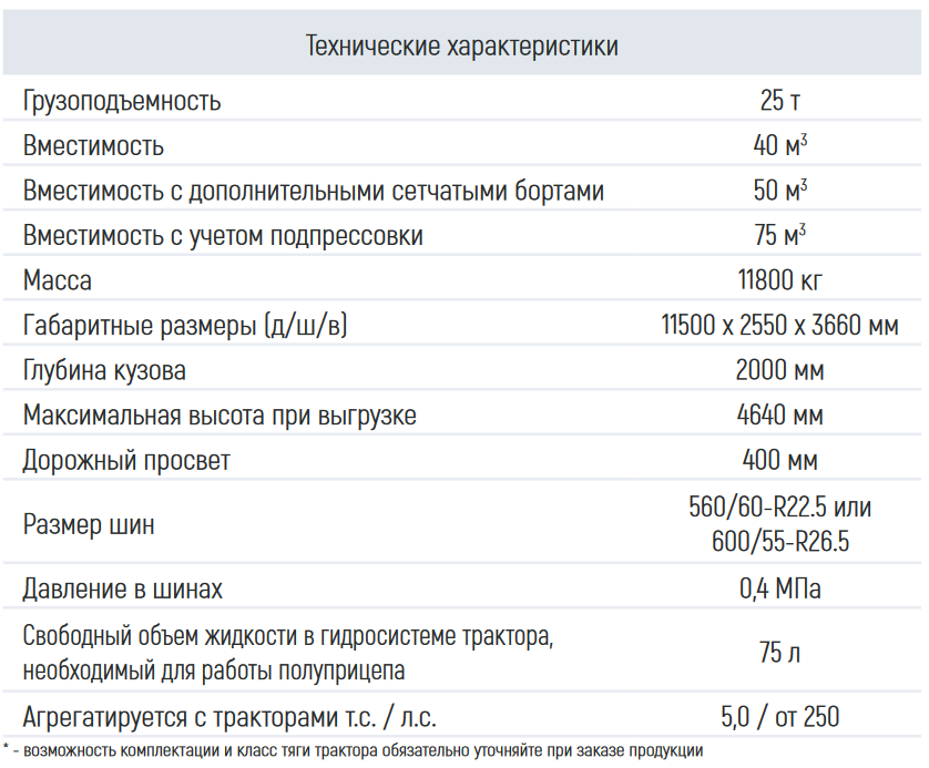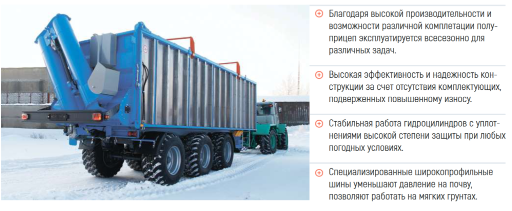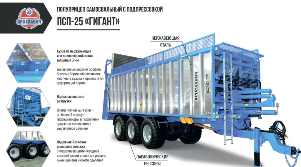 Полуприцеп ПСП-25 «Гигант» предназначен для перевозки различных сыпучих и твердых грузов (зерно, корнеплоды, зеленая масса, силос, сенаж, зерносенаж, навоз, торф, удобрения, опилки, снег и пр.) по всем видам дорог и в полевых условиях. При установке разбрасывателя полуприцеп применяется для поверхностного внесения в почву твердых органических удобрений, извести, щепы и опилок. Является универсальной техникой и может эксплуатироваться круглогодично.