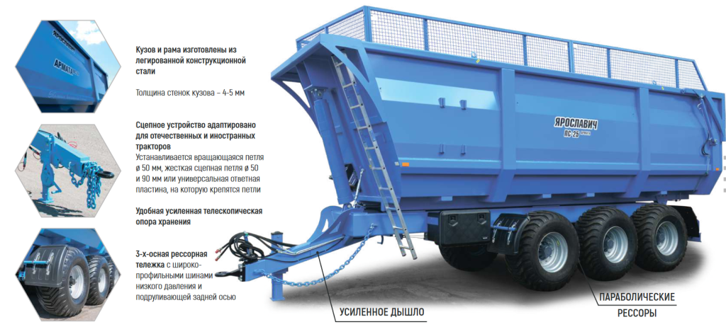 Полуприцеп ПС-25Б «Армата» предназначен для перевозки сыпучих и твердых грузов (зерно, корнеплоды, зеленая масса, силос, сенаж, зерносенаж, навоз, торф, песок, гравий, удобрения, опилки, снег и пр.) по всем видам дорог и в полевых условиях.