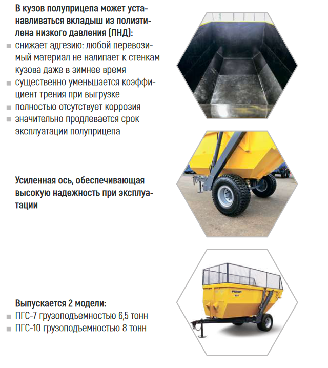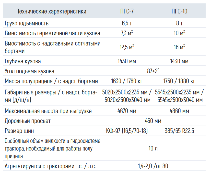 Полуприцепы ПГС-7 и ПГС-10 предназначены для транспортировки различных сельскохозяйственных грузов: зерновых, корнеплодов, твердых, полужидких и жидких органических удобрений, строительных материалов и других грузов по всем видам дорог, а также в полевых условиях. При использовании надставных бортов возможно перевозить сено, сенаж, зерносенаж, силос.