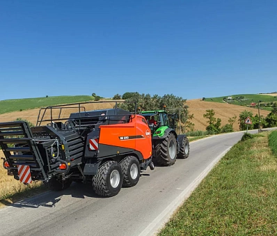 Она обеспечивает доступность внутренних компонентов машины в процессе проведения ежедневных осмотров и технического обслуживания. В целях гарантии безопасности дека узловязателя оборудована надежной лестницей и предохранительными перилами. Предохранительные перила можно легко сложить, сократив тем самым высоту машины для удобства транспортировки. Кроме того, максимальный комфорт водителя обеспечивается за счет наличия тяжелого маховика, гидросистемы с управлением по нагрузке и регулятора крутящего момента.