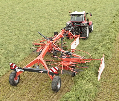 С помощью этих валковообразователей с боковой укладкой вы можете контролировать объем растительной массы в валке: образование отдельных валков или совмещение двух проходов для формирования одного валка. Вы также можете регулировать рабочую ширину для получения оптимального размера валка. Результат: оптимизация производительности для одного гектара при последующей работе пресс-подборщиков и другой уборочной техники. Данная модель позволяет осуществлять укладку в один или два отдельных валка. Вы оцените ее универсальность при переворачивании двух валков для более быстрой сушки и более эффективного валкования в ночное время. При укладке двух валков процесс сушки тяжелых культур также проходит быстрее.