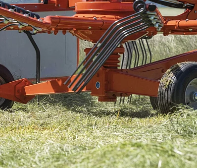 - Четыре колеса на каждом роторе, расположенные максимально близко к граблинам, обеспечивают отличное сцепление с землей. Тандемное шасси с шестью колесами рекомендуется всем, кто хочет добиться еще более совершенных результатов (опциональное оснащение для GA 8731 и стандартное для GA 9531).