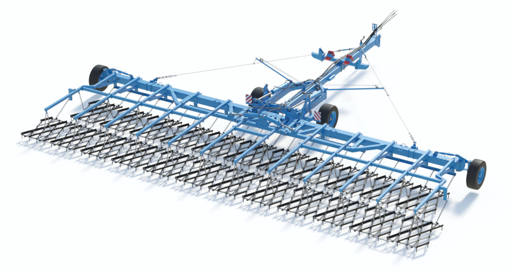 Сцепка зубовых борон гидрофицированная ЗАРЯ СБГ-21-1. Ширина захвата сцепки — 21 м. Производительность 25 гектаров в час.