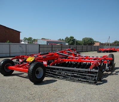 Большая рабочая скорость обработки (до 18 км/ч) позволяет достигать превосходного эффекта измельчения, перемешивания и улучшения крошения почвенного комка, благодаря полному перекрытию рабочей ширины рабочими органами и сдвоенным опорным шлейф-каткам разного диаметра. Вибрация пружинной стойки во время работы дополнительно улучшает крошение почвы. Глубина обработки до 12 см регулируется винтовым механизмом передних опорных колес и задними опорными катками. Сферические диски Bellota диаметром 560 мм установлены наклонно, на индивидуальных пружинных стойках Bellota в 2 ряда, что способствует лучшему обороту отрезаемого пласта, а также снижению требуемого тягового усилия трактора.