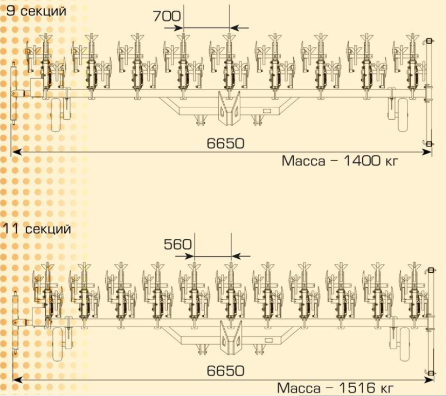 Возможно использование как пружинной, так и жесткой стойки. Базовая комплектация включает пружинные стойки со стрельчатыми лапами, транспортной сцепкой и тележкой.