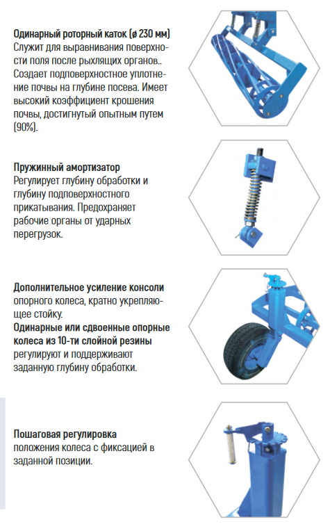 • выполняют качественную обработку почвы всего за один проход(рыхление, вычесывание сорняков, выравнивание, создание семянного ложа, предпосевное прикатывание, мульчирование).
